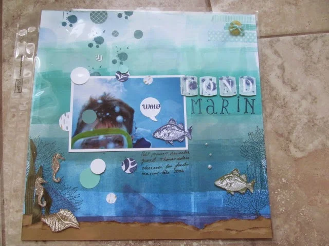 J'ai vraiment eu beaucoup de plaisirs a présenter cette page ''Fond Marin'' lors de mon dernier atelier Mixed media. Mon fond a été fait avec le rouleau-tampon et 6 couleurs Stampin'Up de bleu , en allant du plus pâle au plus foncé...a essayer !